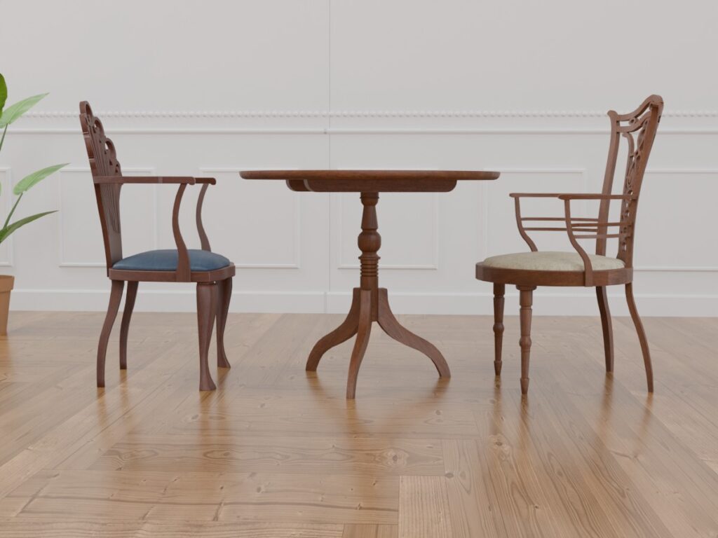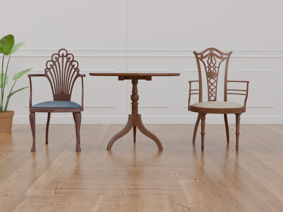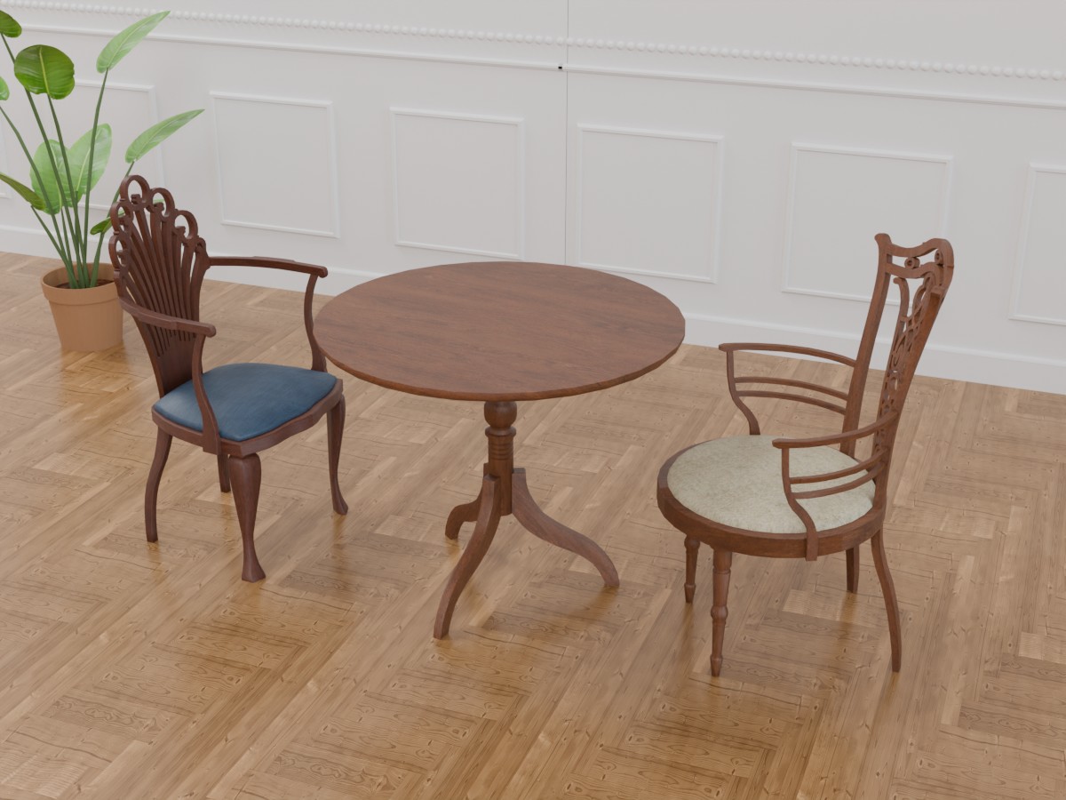Blenderで作ったVRCで利用できる室内装飾用のアンティークテーブルチェアセットです。