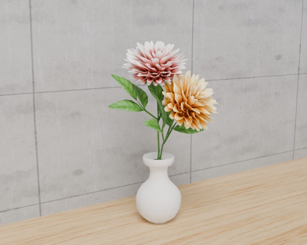 2026-01-21 / 最終更新日 : 2026-01-21 omisenet 3DCGMODEL ダリア VRC対応室内装飾品~花シリーズ ダリア VRC対応室内装飾品~花シリーズキク科のダリアはいろいろな形があります。作成したのはボール咲きと呼ばれるタイプの大型のダリアです。ピンクの花、オレンジの花、花瓶の3つ分かれています。ナポレオンの皇后ジョセフィーヌの庭園で育てられたいわれているそうです。ダリアは色によって異なる花言葉がついているらしいです。赤色 :華麗、気品黄色: 優美、栄華白色 感謝、豊かな愛情 ※写真背景はあくまでイメージで実際のデータには含まれておりません。※サンプル画像は照明の関係で実際の色味から少し明るく見える場合があります。●内容dahlia.fbxサイズ:花瓶含むW356xD356xH650㎜総頂点数:14,492(1本7112)三角形面:27,952(1本13716)●作製UnityパッケージFBXBlenderデータテクスチャファイル付属※画像およびポリゴンの生成系AIを使用していません。●利用について利 用:制限なし/商用利用可/クレジット表記不要再販不可:付属しているデータの再配布、販売は改変の有無を問わず禁止とさせていただきます。●注意事項※ご購入後の返金対応は致しません。※著作権は「ユーザー名」に帰属します。※本モデルを使用して発生した、いかなる損害・損失・その他不利益等には、当方は一切の責任を負いません。●不明点について本商品の使用方法に関しては、何か不明な点、その他確認したい事項がございましたらお尋ね下さい。https://saijido.booth.pm/items/7900510 FacebookX